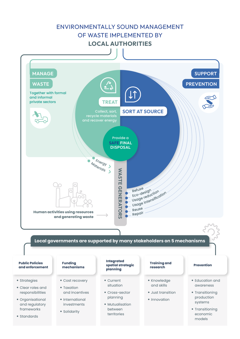 This document focuses on Mechanisms to support the implementation of efficient municipal waste management systems adapted to national and local conditions. Local authorities are often mandated to manage waste that cannot be prevented. They are dependent on national policies on prevention (priority 1) and recovery (priority 2), and work with local recyclers who recover waste when a market exists.