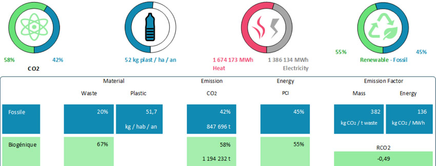 An algorithm assesses biogenic and fossil CO2, the waste composition, and the renewable energy fraction.